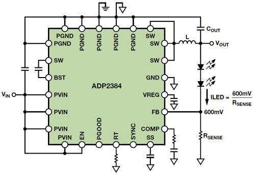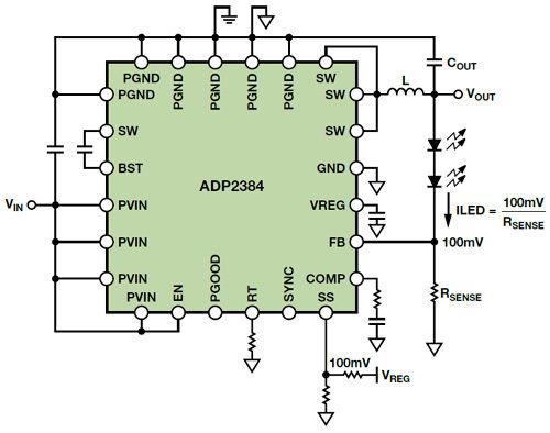 如果開關(guān)是內(nèi)部的,則降壓器稱為穩(wěn)壓器,如果開關(guān)是外部的,則稱為控制器。如果兩個開關(guān)都是晶體管(MOSFET或BJT),則它是同步的,如果底部的開關(guān)是使用二極管實施的,則它是異步的。這些類型的降壓電路各有優(yōu)劣,但同步降壓穩(wěn)壓器通?梢詢(yōu)化效率、器件數(shù)量、解決方案成本和電路板面積。遺憾的是,用于驅(qū)動高電流LED(高達(dá)4A)的同步降壓穩(wěn)壓器很少,而且成本昂貴。本文以ADP2384為例,展示如何修改標(biāo)準(zhǔn)同步降壓穩(wěn)壓器的連接以調(diào)節(jié)LED電流。