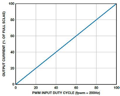 圖10. ADP2384 PWM調(diào)光線性度—200 Hz下的輸出電流與占空比
