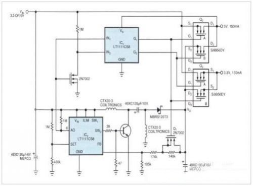 圖1,當(dāng)從5V元件轉(zhuǎn)用3.3V元件時(shí),用圖中這種雙輸出穩(wěn)壓器可設(shè)計(jì)出能使用3.3V和5V器件的表面安裝PC板。此外,這款新穎的穩(wěn)壓器還能同時(shí)接受3.3V或5V的輸入電源。
