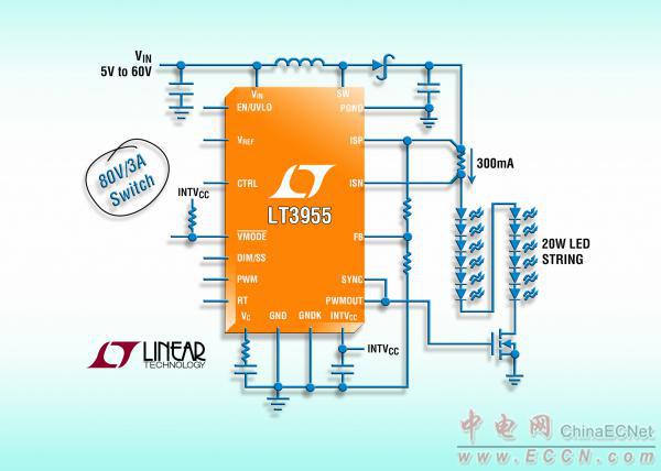 Linear推出 DC/DC 轉(zhuǎn)換器 LT3955,該器件具有一個(gè)內(nèi)部 3.5A 開(kāi)關(guān),專為用作恒定電流源和恒定電壓穩(wěn)壓器而設(shè)計(jì)。該器件的內(nèi)部 PWM 調(diào)光發(fā)生器使其非常適合驅(qū)動(dòng)大電流 LED,而且它還具有適用于對(duì)電池和超級(jí)電容器充電的功能。LT3955 的 4.5V 至 60V 輸入電壓范圍適合包括汽車、工業(yè)和建筑照明等多種應(yīng)用。