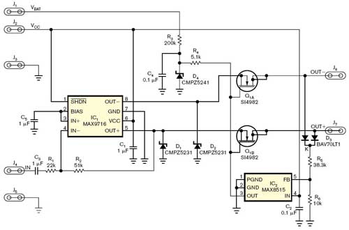 汽車電子產(chǎn)品的一個普遍要求是直接連接到配線裝置,必須能夠經(jīng)得起電池電壓的短路。雖然殘酷,但這項(xiàng)規(guī)定對可靠性與安全來說是必要的。一個需要這種保護(hù)的例子是用于汽車內(nèi)部產(chǎn)生間接噪聲的音頻放大器。雖然工作電壓為3.3或5v,低于電池電壓,但放大器必須能夠忍受滿電池電壓。還可以使用適合其他汽車電路中放大器的保護(hù)網(wǎng)絡(luò) (圖1)。一個雙N溝道場效應(yīng)管隔離從接線結(jié)點(diǎn)到另一端的高壓條件的放大器輸出。該場效應(yīng)管,Q1A 和Q1B,通常情況下是開著的;齊納擊穿二極管D4及其偏置元件驅(qū)動場效應(yīng)管的門限大約達(dá)到11V。雙二極管D3提供OR二極管連接到每個輸出的直流電壓,從而產(chǎn)生電壓控制分流調(diào)節(jié)器IC2的輸出。電路保護(hù)IC1,1.4W的AB類放大器適于為汽車電子提供聲音警告和指示。