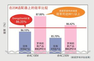 為了提高效率,采用了羅姆自產(chǎn)的高效超級(jí)結(jié)MOSFET;為了最大限度發(fā)揮出內(nèi)置MOSFET的性能,徹底優(yōu)化了驅(qū)動(dòng)電路。效率符合Energy Star 6.0要求的86.35%,用于AC100V、25W的適配器時(shí),與一般產(chǎn)品相比,僅僅替換IC本身就能實(shí)現(xiàn)87%以上的效率。通過(guò)進(jìn)一步優(yōu)化外圍部件,效率還可改善到90%以上。