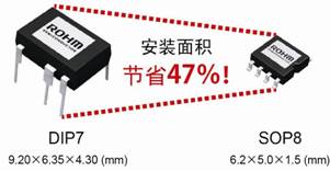 AC/DC一般多采用平面型MOSFET,因散熱問(wèn)題而較難實(shí)現(xiàn)小型化。此次,羅姆采用了自產(chǎn)的超級(jí)結(jié)MOSFET。通過(guò)內(nèi)置多種保護(hù)功能減少了外置部件數(shù)量。8W級(jí)別以下的產(chǎn)品,除了標(biāo)準(zhǔn)的DIP7封裝,又新增了可表面貼裝的SOP-8封裝產(chǎn)品。采用SOP-8封裝(6.2mm×5.0mm×1.5mm)產(chǎn)品,安裝面積可節(jié)省47%,不僅能使配套產(chǎn)品更加小巧,而且設(shè)計(jì)和基板布局也更加簡(jiǎn)單。