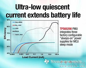 TPS65290 PMU 整合三個(gè)支持微控制器 (MCU) 睡眠模式的廠家可配置“常開”電源以及一個(gè)可從輸入電壓或升降壓轉(zhuǎn)換器選擇電源的自動(dòng)功能。此外,TPS65290 還能夠與 TI 超低功率 MSP430F5328 等 MSP430 MCU 無縫工作。