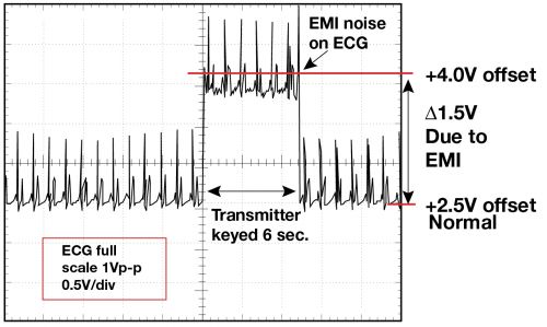 圖1 1.5 英尺以外的發(fā)射器(f = 470 MHz, P= 0.5W)開啟和關(guān)閉時ECG 診斷設(shè)備的心臟檢查結(jié)果