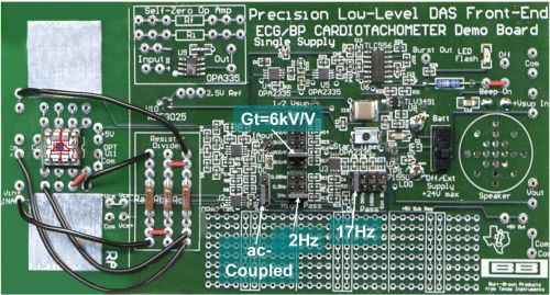 圖1 中,系統(tǒng)的心臟輸入信號約為 0.25 mVp-p。這種小信號要求有 6000 V/V 左右的測量放大器增益。幸運(yùn)的是,圖1 所示情況并不代表醫(yī)用 ECG 測量設(shè)備的實(shí)際性能。這種測量實(shí)際是使用圖2 所示電路板在工程師的實(shí)驗(yàn)室中進(jìn)行的。