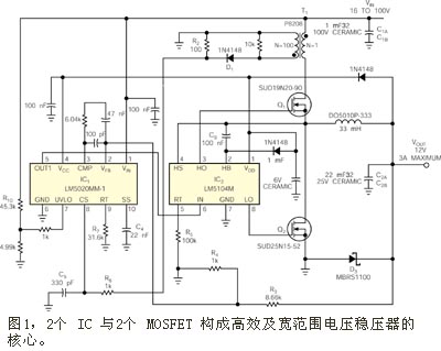 圖1所示電路采用美國國家半導(dǎo)體公司 (National Semiconductor) 的LM5020型電流模式PWM IC來驅(qū)動 LM5104 的柵極驅(qū)動器IC2, 以形成一個同步控制器。LM5020 包括一個可承受最高100V輸入電壓的內(nèi)部線性穩(wěn)壓器,并可提供為LM5104供應(yīng)驅(qū)動電流的輸出。為降低高輸入電壓下的功耗,在起始功率加上后,1N4148 型二極管D2為電路其他部分提供一個11.5V的自舉電壓。由Pulse Engineering公司提供的100比1電流變壓器T1在MOSFET Q1導(dǎo)通期間提供電流反饋。Q1與 Q2均為具有低柵極電荷要求與低導(dǎo)通阻抗的 Siliconix Dpak 器件,用來減小電路在 200kHz 工作頻率上的總開關(guān)損耗。所有電容器均采用 陶瓷介質(zhì)結(jié)構(gòu)的,以承受高溫并滿足封裝尺寸的制約。