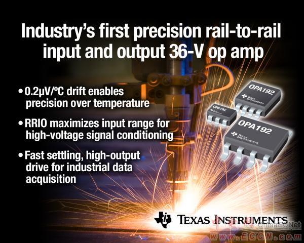 TI宣布推出業(yè)界首款 36 V 軌至軌輸入輸出 (RRIO) 運算放大器,其可在無需使用自動歸零技術(shù)的情況下實現(xiàn)高精度失調(diào)電壓與漂移。該 OPA192 在整個規(guī)定溫度范圍內(nèi)可實現(xiàn)穩(wěn)定的失調(diào)電壓漂移,無需系統(tǒng)級校正。