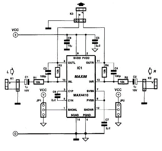 兩路立體聲每個(gè)聲道均可以借助斷開(kāi)跳線JP1和2獨(dú)立關(guān)斷。正常工作時(shí)JP1和JP2與電源相連。如果兩個(gè)聲道同時(shí)關(guān)斷。則供給泵就自動(dòng)切斷。這時(shí)電流消耗僅有6uA左右,非常省電。