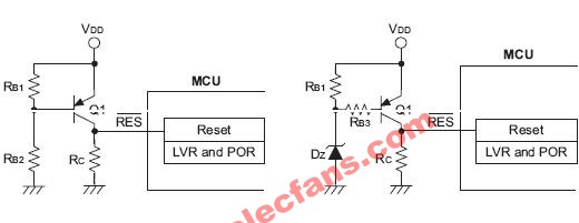 當(dāng)內(nèi)建的低電壓復(fù)位電路的電壓與應(yīng)用規(guī)格不同時(shí),可選用外部三極管低電壓復(fù)位電路。