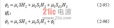 (2-95)、(2-96)式中,μ0sd2H2=φ2就是變壓器次級線圈N2對初級線圈N1的漏磁通;因為,這一部分磁通沒有穿過變壓器初級線圈 N1。漏磁通可以等效成是由一個電感單獨產(chǎn)生,這個電感就稱為漏感,記為Ls。同理,也可以求得流過變壓器初級線圈N1中的電流I1產(chǎn)生的磁通量為: