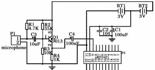 發(fā)送端的電路圖3如圖所示。在麥克風(fēng)和nRF2401的ADC模塊之間,需要有前置濾波放大電路。它對(duì)麥克風(fēng)拾到的模擬音頻信號(hào)進(jìn)行濾波放大。放大后的模擬音頻信號(hào)被送到ADC中。