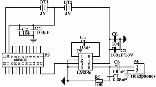 接收端的電路圖如4圖所示。nRF24E1芯片提供一個(gè)PWM輸出口。nRF24E1的PWM輸出信號(hào),通過一級(jí)放大,就可以得到所需的音頻模擬信號(hào)。