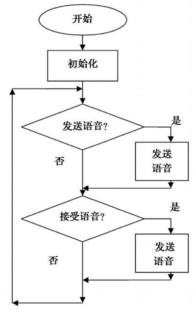 1.系統(tǒng)上電,打開系統(tǒng);2.進(jìn)行初始化。對(duì)8051的定時(shí)器time2、PWM輸出端口、ADC轉(zhuǎn)換器、RADIO、SPI接口和無線收發(fā)模塊nRF2401進(jìn)行初始化;3.判斷是否要發(fā)送語音信號(hào),如果有則發(fā)送,然后進(jìn)入步驟4;4.如果沒有語音發(fā)送,則判斷是否要接收語音信號(hào)。如果有,則接收,然后進(jìn)行步驟3;5.如果沒有語音接收,則重新進(jìn)行步驟3.