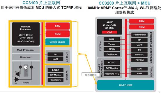 CC3100是一個(gè)片上的Wi-Fi平臺(tái),可以與外部一些低成本的MCU如MSP430結(jié)合起來開發(fā)一個(gè)物聯(lián)網(wǎng)的應(yīng)用,而CC3200是將Wi-Fi處理器與一個(gè)基于ARM Cortex-M4 MCU集成在一起的片上平臺(tái),具有更多外設(shè)和接口,可以直接用于開發(fā)一個(gè)物聯(lián)網(wǎng)產(chǎn)品。