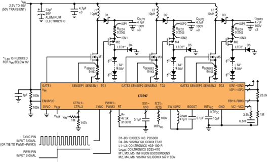 LT3797 是一款 2.5V 至 40V 輸入和高達(dá) 100V 輸出的三通道 LED 驅(qū)動器,其可在多種拓?fù)渲惺褂谩.?dāng)需要進(jìn)行升壓和降壓時,對于 1000:1 或更高的最高 PWM 調(diào)光比,該器件的一個通道可用作升壓預(yù)調(diào)節(jié)器,而另兩個通道則用作降壓模式 LED 驅(qū)動器。在所有的拓?fù)渲芯峁┝硕搪繁Wo(hù),從而使得該 IC 成為一款堅固和強(qiáng)大的解決方案,適合在眾多的應(yīng)用中驅(qū)動 LED。