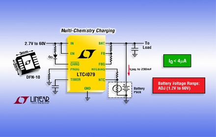 Linear推出 60V、恒定電流 / 恒定電壓 250mA 多化學(xué)組成電池充電器 LTC4079。該器件的低靜態(tài)電流線性拓撲可提供一種簡單的無電感器設(shè)計,并接受 2.7V 至 60V 的輸入電壓范圍。一個可利用電阻設(shè)置的 1.2V 至 60V 電池充電電壓范圍和 ±0.5% 的嚴格充電電壓準確度以及內(nèi)置的充電終止使得 LTC4079 適合多種電池化學(xué)組成 (包括: 鋰離子、鎳和鉛酸電池)。充電電流可利用一個外部電阻器在 10mA 至 250mA 的范圍內(nèi)進行調(diào)節(jié),與同類競爭的充電器不同,LTC4079 可在低充電電流下保持高準確度。典型應(yīng)用包括嵌入式汽車和工業(yè)系統(tǒng)、后備電池充電、能量收集和薄膜電池產(chǎn)品。