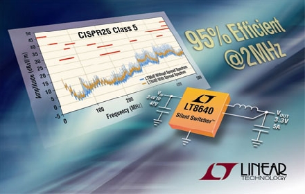 Linear推出 5A、42V 輸入同步降壓型開關(guān)穩(wěn)壓器 LT8640。該器件采用獨特的 Silent Switcher® 架構(gòu),整合了擴展頻譜調(diào)制,即使開關(guān)頻率超過 2MHz 時,依然能夠?qū)?EMI / EMC 輻射降低超過 25dB,從而使該器件能夠輕松地滿足汽車 CISPR25 Class 5 峰值限制要求。同步整流在開關(guān)頻率為 2MHz 時可提供高達 95% 的效率。其 3.4V 至 42V 輸入電壓范圍使該器件非常適合汽車和工業(yè)應(yīng)用。