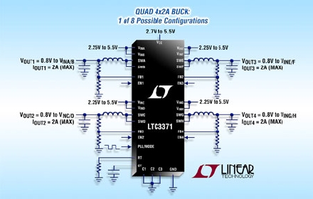 Linear推出高度集成的通用型電源管理解決方案 LTC3371,以用于需要多個低壓電源的系統(tǒng)。該器件具有四個同步降壓型轉(zhuǎn)換器,各由獨(dú)立的 2.25V 至 5.5V 輸入供電,而且均可通過配置以共享 8 個可用 1A 功率級中的最多 4 個。利用 8 種獨(dú)特的輸出電流配置,LTC3371提供了實質(zhì)的靈活性以及容易重復(fù)使用于不同應(yīng)用中。該器件是多種多通道工業(yè)、汽車、通信和分布式電源系統(tǒng)的理想選擇。