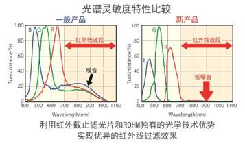 “BH1745NUC” 采用ROHM獨(dú)創(chuàng)的紅外線過(guò)濾技術(shù)和運(yùn)算方法,實(shí)現(xiàn)業(yè)界最高的紅外線過(guò)濾特性,使紅外線的影響降低到以往產(chǎn)品的1/10以下。因此,還可適用于傳統(tǒng)色彩傳感器因受紅外線影響而無(wú)法準(zhǔn)確檢測(cè)的深色(透光率低)光學(xué)窗口。
