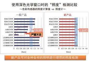 實(shí)現(xiàn)業(yè)界最高的紅外線過(guò)濾特性,將紅外線的影響降到以往產(chǎn)品的1/10以下,從而可有效提取出可視光。使用設(shè)計(jì)  自由度更高的深色光學(xué)窗口也可檢測(cè)可視光,從而可在不同照明情況下,更準(zhǔn)確地計(jì)算出照度和色溫。