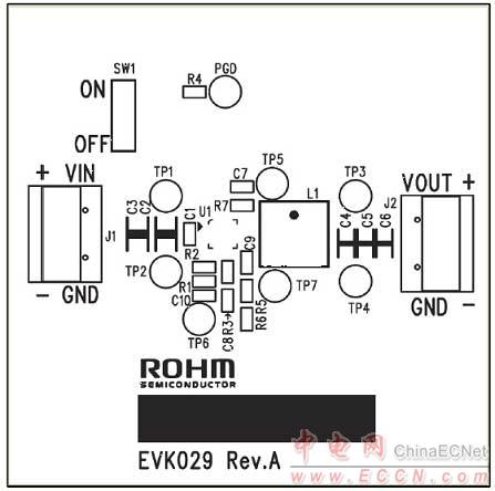 圖6.BD9A600MUV-EVK-001評(píng)估板PCB元件布局和絲印圖(頂層)