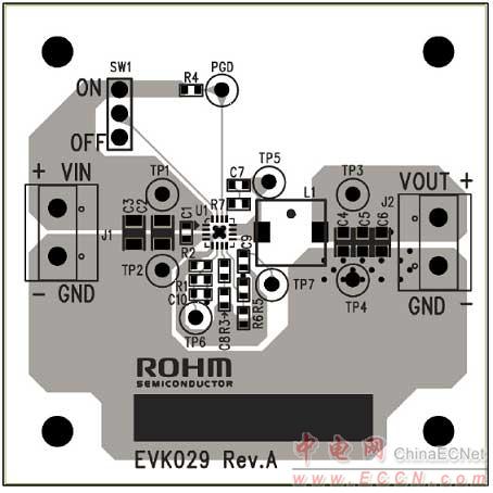 圖5.BD9A600MUV-EVK-001評(píng)估板PCB元件布局圖(頂層)