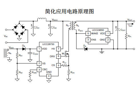 現(xiàn)有初級(jí)側(cè)穩(wěn)壓電源的主要設(shè)計(jì)局限在于如何在保持低待機(jī)功率的情況下,仍保證較高的瞬變響應(yīng)性能。UCC28730和UCC24650芯片集在盡可能提供最佳瞬變響應(yīng)性能的同時(shí),實(shí)現(xiàn)了零待機(jī)功耗。其中UCC24650不僅免除對(duì)光耦合器件和TL431等回饋組件的需要,從而降低了成本,而且其內(nèi)置喚醒控制器中的TI電壓偏低檢測(cè)功能還在保持窄輸出電壓穩(wěn)壓窗口(支持零到滿負(fù)載瞬變)的情況下,還可以應(yīng)用微型輸出電容器。