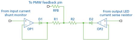 通過將輸入電流與輸出電流以邏輯“或”的配置方式相連接,可實現(xiàn)對輸入的鉗制。如圖3中所示,其目的是為了生成一個驅(qū)動PWM控制器的復(fù)合反饋信號。然后,CSM使輸出電流反饋無效,并且強制LED電流在輸入電壓下降到一個預(yù)設(shè)電平以下時減少,從而限制輸入電流。