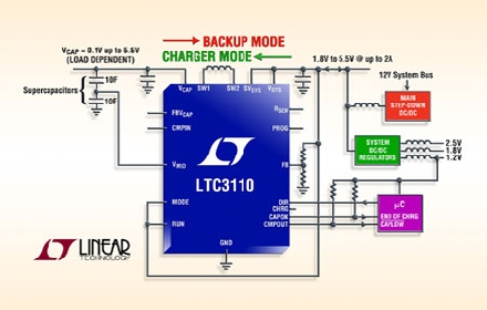 Linear推出雙向、輸入電流可編程的降壓-升壓型超級電容器充電器 LTC3110,該器件具主動充電平衡,適合單或兩節(jié)串聯(lián)超級電容器。專有的低噪聲降壓-升壓型拓撲使該器件相當于兩個單獨的開關(guān)穩(wěn)壓器,從而減小了尺寸和成本,并降低了復雜性。LTC3110 可于備份和充電兩種模式工作。在備份模式,該器件由超級電容器儲存的能量供電,保持 1.71V 至 5.25V 的系統(tǒng)電壓 (VSYS)。此外,超級電容器存儲輸入 (VCAP) 具備實用的寬工作范圍,可從 5.5V 直至 0.1V。這確保實際儲存的全部超級電容器能量都能得到利用,因此延長了備份時間或減小了存儲電容器尺寸。而在充電模式中,當主電源系統(tǒng)有效時,LTC3110 可自主地或通過用戶命令將功率流動改為相反方向,利用穩(wěn)定的系統(tǒng)電壓給超級電容器充電并作出平衡。降壓-升壓型 PWM (脈沖寬度調(diào)制器) 使 VCAP 高效地充電至高于或低于 VSYS。該器件還具備充電模式平均輸入電流限制,能夠以 ±2% 的準確度設定至高達 2A,從而防止系統(tǒng)電源過載,同時最大限度縮短電容器再充電時間。