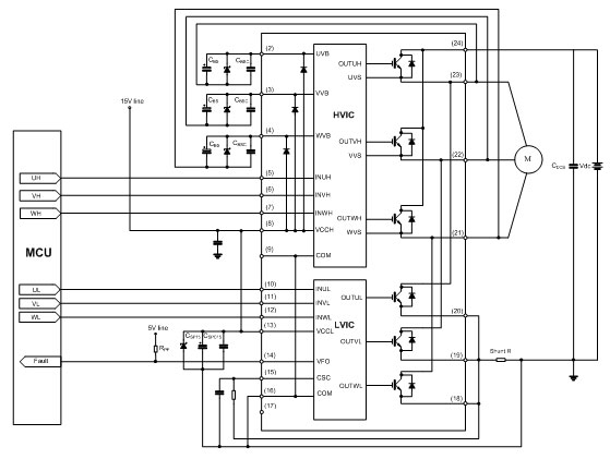 SD15G60FA/FB是高度集成、高可靠性的3相無刷直流電機驅動電路,主要應用于較低功率的變頻驅動領域,如空調(diào)、電冰箱、洗衣機等。其內(nèi)置了6個低損耗600V/15A IGBT管和3個高速半橋高壓柵極驅動電路。