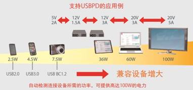 利用USB連接線,可進行高達100W供受電的USB功率擴展標準?山o筆記本電腦等以往無法通過USB供電進行驅動的設備供電,可實現(xiàn)移動設備的快速充電(縮短充電時間)。