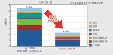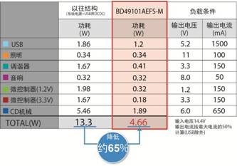 以往,高效率的DC/DC轉(zhuǎn)換器因外置部件較多而  存在成本高、安裝面積增大等問題。但是,本產(chǎn)品優(yōu)化了系統(tǒng)整體的結(jié)構(gòu),通過DC/DC轉(zhuǎn)換器和線性穩(wěn)壓器的  最佳組合,將DC/DC轉(zhuǎn)換器控制在2通道輸出系統(tǒng)之內(nèi),大大改善了效率的同時還降低了成本。由此,大幅降低 工作時功耗較大的CD機械部和微 控制器等的功耗,實現(xiàn)了業(yè)界最低的運行功率。