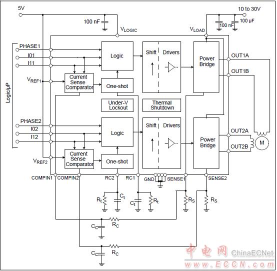 全、半和微步進(jìn)操作可以利用PWM電流控制和邏輯輸入來(lái)實(shí)現(xiàn)。最高輸出電流取決于感應(yīng)電阻和用戶可選參考電壓。輸出電流限制可以利用2個(gè)邏輯電平輸入進(jìn)行選擇?蛇x輸出電流限制為最高輸出電流的0%、33%、67%或100%。每個(gè)電橋都具有PHASE輸入信號(hào),可用于控制流過(guò)H橋和負(fù)載的電流方向。
