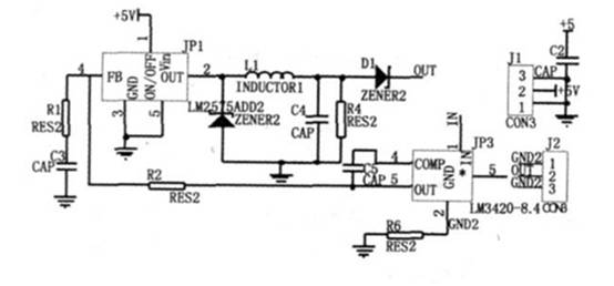 鋰離子電池的充電特性和鎳鎘、鎳氫電池的充電特性有所不同, 鋰離子電池在充電時, 電池電壓緩慢上升, 充電電流逐漸減小, 當(dāng)電壓達(dá)到4.2V 左右時, 電壓基本不變, 充電電流繼續(xù)減小。因此對于改型充電器可先用先恒流后恒壓充電方式進(jìn)行充電, 具體充電電路如圖4 所示。該電路選用LM2575ADJ 組成斬波式開關(guān)穩(wěn)壓器, 最大充電電流為1A.