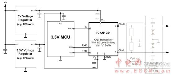 圖4.TCAN1051HGV-Q1采用3.3V CAN控制器的典型CAN總線應(yīng)用框圖