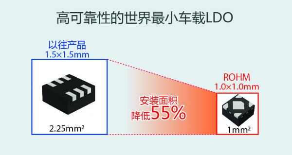ROHM充分發(fā)揮一條龍生產(chǎn)體制多年來積累的設計與制造技術優(yōu)勢,成功攻克了該課題,開發(fā)出支持車載標準AEC-Q100的1mm見方塑封的世界最小車載LDO穩(wěn)壓器。