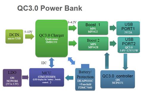 移動(dòng)電源輸入除適用一般5V適配器外,最大特點(diǎn)是支持QC3.0適配器,讓移動(dòng)電源本身電池也具備快充功能,最大充電電流更高達(dá)4.5A,可于半小時(shí)內(nèi)讓移動(dòng)電源充電達(dá)80%電量。系統(tǒng)中MCU內(nèi)建程序包含充、放電燈號(hào)顯示、電量顯示與相關(guān)保護(hù)功能。