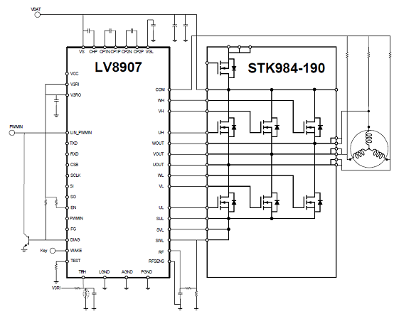 The STK984-190-E is a MOSFET power module containing 6 MOSFETsin a three-phase bridge (B6) configuration and a seventh MOSFET usedas a reverse battery protection switch. The compact module is 29.6 mmx18.2 mm and is 4.3 mm high (see package drawing for specificationdetails). The MOSFET module uses a DBC substrate for excellentthermal performance. The module is suitable for 12 V automotive andindustrial applications with motors rated up to 300 W.