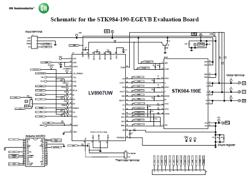 The STK984-190-EGEVB is designed to evaluate the STK984-190E, a MOSFET power module containing 6 MOSFETs in a three-phase bridge (B6) configuration and a seventh MOSFET used as a reverse battery protection switch. The MOSFET module uses a DBC substrate for excellent thermal performance and is suitable for 12 V automotive and industrial applications with motors rated up to 300 W.
