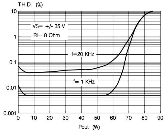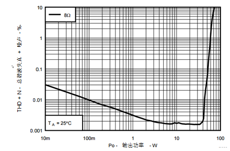 上一代的D級放大器實(shí)現(xiàn)了0.03% (-70dB)的總諧波失真+噪聲,相比之下,擁有相似輸出功率的AB級放大器的總諧波失真為0.005% (-86dB),如圖2所示。圖3顯示了同樣的對比,但它使用了TI最新的高功率D級放大器。此前,雖然D級放大器在高功率水平時(shí)的效率要提高大約1.5倍,因此和相似功率的AB級放大器相比不需要很多散熱,但對于高清音頻,人們并不會考慮使用D級放大器。
