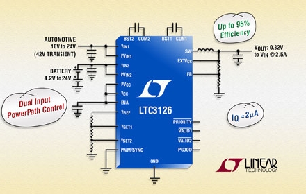 Linear推出2.5A、42V 同步降壓型開關(guān)穩(wěn)壓器 LTC3126,該器件集成了雙輸入電源通路 (PowerPath™) 控制。LTC3126 獨(dú)特的電源級拓?fù)湓试S用兩個(gè)獨(dú)立的電源之一運(yùn)行,輸入之間可無縫轉(zhuǎn)換且轉(zhuǎn)換是內(nèi)部控制的,以在發(fā)生熱插拔和電源斷接事件時(shí)確保穩(wěn)定的輸出電壓。該器件的內(nèi)部電源開關(guān)和同步整流相結(jié)合,可在寬電壓范圍內(nèi)提供 95% 的效率、實(shí)現(xiàn)快速瞬態(tài)響應(yīng)并在以 2MHz 切換時(shí)確保出色的環(huán)路穩(wěn)定性。這就使設(shè)計(jì)師能夠避開關(guān)鍵的噪聲敏感頻段 (例如 AM 無線電頻段),同時(shí)又可提供占板面積非常緊湊的解決方案。LTC3126 的電流模式拓?fù)涫莾?nèi)部補(bǔ)償?shù),從而無需外部補(bǔ)償組件。突發(fā)模式 (Burst Mode®) 運(yùn)行可在低輸出電流時(shí)保持高效率,同時(shí)保持峰至峰值輸出紋波低于 1%。此外,在無負(fù)載備用情況下,該器件的靜態(tài)電流低于 2µA,因此非常適合始終保持接通系統(tǒng)和便攜式應(yīng)用。LTC3126 的 2.4V 至 42V 寬輸入范圍和 0.818V 至 VIN 的輸出范圍非常適合汽車應(yīng)用,因?yàn)檫@類應(yīng)用必須穩(wěn)定通過冷車發(fā)動(dòng)、負(fù)載突降和停-啟情況。其他關(guān)鍵應(yīng)用包括便攜式工業(yè) / 通信測試設(shè)備、電池和超級電容器備份電源系統(tǒng)、具電池備份的汽車電源、不間斷電源、由未調(diào)整的墻上適配器供電之系統(tǒng)或大多數(shù)電池化學(xué)組成的單節(jié)至多節(jié)電池組。