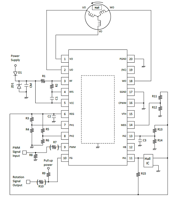 圖2.采用一個(gè)霍爾傳感器的LV8811G/13G三相BLDC馬達(dá)驅(qū)動(dòng)電路圖(1)