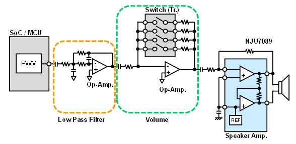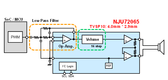 最近,越來越多設(shè)備都裝有音頻輸出。在音頻輸出電路里除了有揚(yáng)聲器放大器之外,更多需求是伴有簡單的音量調(diào)節(jié)功能。 于是,我們就開發(fā)了帶音量調(diào)節(jié)功能的揚(yáng)聲器放大器NJU72065。它不光能接收模擬音頻信號,也可以靈活應(yīng)對從MCU發(fā)出的PWM信號。 因此,系統(tǒng)規(guī)模會變得更加簡單,設(shè)計(jì)會更加容易。 此外,NJU72065采用的是小型封裝,且僅僅配備幾個(gè)外接被動元件就可構(gòu)成音頻輸出電路,可有效縮小電路板面積,節(jié)省成本。