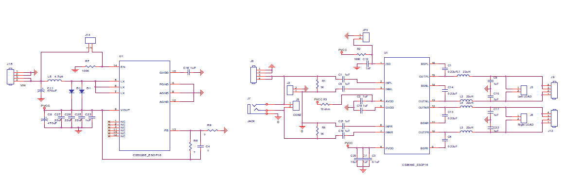在雙節(jié)鋰電池串聯(lián)的供電情況下,CS5026E配套使用D類功放芯片CS8655實現(xiàn)2X15W的功率輸出
