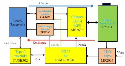 此次推出的方案的USB Type-C控制采用軟件控制設(shè)計(jì),具有成本較低,彈性較大的優(yōu)點(diǎn),對(duì)設(shè)計(jì)者開放Type-C與PD控制軟件,工程師可以用軟件升級(jí)Type-C PD 版本;硬件采用飛兆半導(dǎo)體(Fairchild)的 FUSB302 Type-C 控制器,搭配了ST的Cortex M0 32位單芯片STM32F030K6,電源芯片采用MPS充電與升壓二合一IC---MP2636,充放電雙向皆可支持3A電流,達(dá)到雙向快充的功能。