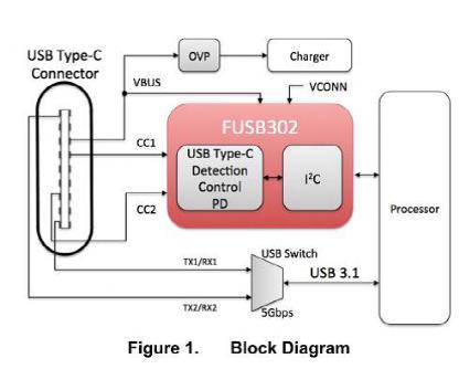 圖示3-USB Type-C移動(dòng)電源之Type-C Controller-Fairchild FUSB302系統(tǒng)架構(gòu)圖