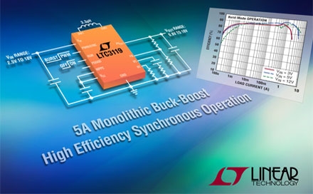 Linear推出同步電流模式單片降壓-升壓型轉換器 LTC3119,該器件在降壓模式提供高達 5A 連續(xù)輸出電流,可以使用多種輸入電源,包括單節(jié)或多節(jié)電池、未調(diào)節(jié)的交流適配器以及太陽能電池板和超級電容器。一旦啟動,該器件的 2.5V 至 18V 輸入電壓范圍可擴展到低至 250mV。輸出電壓在輸入高于、低于或等于輸出時可穩(wěn)定,并可設定在 0.8V 至 18V 范圍。用戶可選的突發(fā)模式 (Burst Mode®) 運作將靜態(tài)電流降至僅為 35µA,從而提高了輕負載時的效率,同時延長了電池運行時間。LTC3119 采用專有的 4 開關 PWM 降壓-升壓型拓撲,在所有工作模式下可提供低噪聲和無抖動切換,因此非常適合對電源噪聲敏感的 RF 和高精確度模擬應用。該器件還包括可編程的最大功率點控制 (MPPC) 功能,從而在使用具高輸出阻抗或光伏電池時,可確保從電源提供最大功率。
