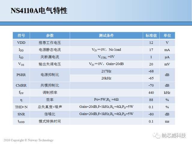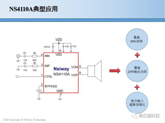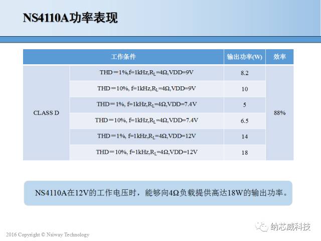 | 納芯威科技全新推出20W單聲道D類音頻功放NS4110A。NS4110A是一款差分輸入,超低EMI,無需濾波器,20W單聲道D類音頻功率放大器。通過高低電平控制芯片開啟與關(guān)斷,當(dāng)高電平時(shí)芯片進(jìn)入D類工作模式,低電平時(shí)芯片關(guān)斷,應(yīng)用靈活方便。NS4110A 采用先進(jìn)的技術(shù),在全帶寬范圍內(nèi)極大地降低了 EMI 干擾,最大限度地減少了對其他外部元件的影響。其輸出無需濾波器的 PWM 調(diào)制結(jié)構(gòu)減少了外部元件、PCB面積和系統(tǒng)成本。NS4110A在12V的工作電壓時(shí),能夠向4Ω負(fù)載提供高達(dá)18W的輸出功率,88%以上的效率更加適合便攜式音頻系統(tǒng)。