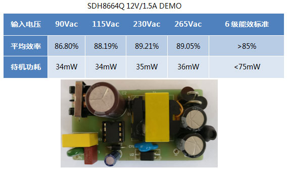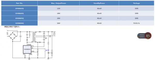 該系列芯片SDH8663/4/5/6Q, 采用DIP8/TO252-5L封裝,可以滿足12W-36W功率范圍,具體參數(shù)如下表示:
